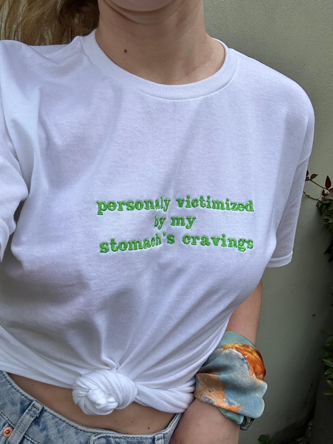 Beautifully Embroidered Women's T-Shirt with Funny Quote 'Personaly Victimized by My Stomach's Cravings' gift for friend, funny Tummy hurts
