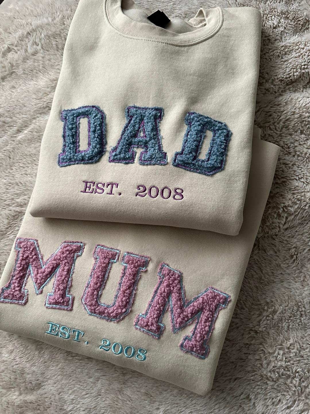 Personalized Mum and Dad Matching Custom Embroidered Sweatshirts Crewneck with Est.Year, Teddy Applique Birthday gift, Mother Day Gift, Father Day Perfect Gift.